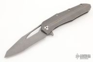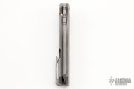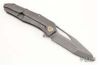 This custom Omen MK2 from Munroe Knives features an acid etched/tumbled, chisel ground CPM-3V blade. The handle scales are crafted from 6AL4V titanium and have a stonewashed finish and several copper inlays. The blade is centered when closed, flips well, and locks up with no play. Copper pivot inlays and pivot pins with titanium fasteners. This piece is in excellent condition. Comes with a zippered case and copper dog tag by Monroe Metal Works.