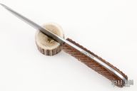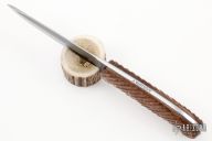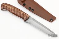 -Signature Grade: My opportunity to explore and deliver a higher level of old world craftsmanship. The performance, high quality heat treat as the working knives, but with more premium features, more striking cosmetics and the use of more rare materials. Finishes can vary, from painstakingly hand rubbed and polished metal, high gloss satin finishes and pattern acid etched finishes. Blades may be stainless, or carbon steel with visible hardening lines-commonly referred to as a hamon. Thicker stock will often come with a tapered tang. You will also see hand sanded handles made from exotic woods, vintage phenolic materials, and other specifically selected accouterments.