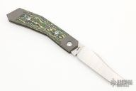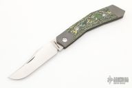 This Cyborg Jack slipjoint model by Jack Wolf Knives features a satin finished drop point blade with nailnick. The handle has integral bead blast finish pinched and fluted titanium front and rear bolsters and liners, Fat Carbon scales with a stainless spring. Comes with box, metallic tube with Sean Tiffany artwork, leather slip, sticker and microfiber cleaning cloth. New from Maker.