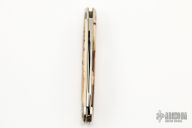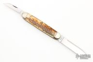 This slipjoint from Northwoods Knives features polished blades with swedges and nail nicks. The handle is comprised of nickel silver bolsters with mammoth ivory covers and over brass liners and stainless steel spring. Has a few light scratches, otherwise excellent condition. Comes with a black leather sheath.