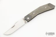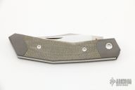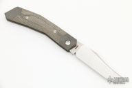 This Cyborg Jack slipjoint model by Jack Wolf Knives features a satin finished drop point blade with nailnick. The handle has integral bead blast finish pinched and fluted titanium front and rear bolsters and liners, micarta scales with a stainless spring. Comes with box, metallic tube with Sean Tiffany artwork, leather slip, sticker and microfiber cleaning cloth. New from Maker.