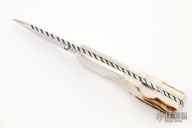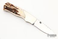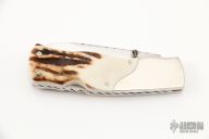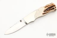 This lockback folder by Sean Mcwilliams features a mirror finished blade with a single thumbstud. The handle has nickel silver bolsters and frame with stag scales.  Fileworked blade spine and backspring.  Includes original McWilliams catalog and a letter from Sean to the original owner.  The letter is dated 1987.  Excellent Condition.