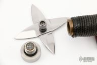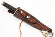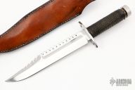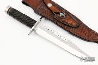 This Hollow Handle Bowie by Gil Hibben features a mirror polished blade with fullers, sawteeth and sharpened top edge, .246" blade stock and 1.496" blade depth, hidden tang hollow handle construction. The handle has a stainless steel guard, cord wrapped hollow handle, stainless steel butt cap with compass inside. Comes with a hand tooled brown leather sheath that also holds a mirror polished Blossom folding throwing star. Dated 3-83 on the blade. Excellent condition.