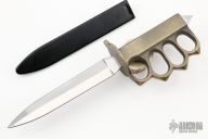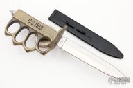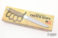 This is a Reproduction WWI L.F & C. trench knife made in China. Cast Brass handle with U.S. 1918 stamped. Has a polished blade with unsharpened edges. Comes with original box and sheath. Excellent condition.