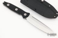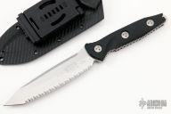 This Socom Alpha by Microtech features a stonewash tanto blade with serrations, a notched thumb ramp and a full tang construction, .163" Blade Stock. 1.189" Blade Depth. The handle features g10 scales. Includes a kydex sheath with a belt clip. Dated 09/2022.  S/N 2080. Excellent Condition. Comes with original box and papers.