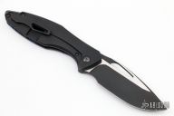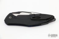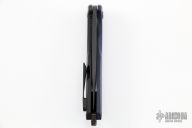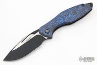 This Arius by Koenig knives features a black cerakote blade. The handle has a black cerakote titanium frame, black/blue carbon fiber front scale, black cerakote titanium backspacer and tip up clip with hidden screws. Has ceramic bearings and a ceramic detent ball. Nice detent, lockup and blade seating. Comes with original box and COA dated Nov 16, 2020. Excellent condition.