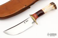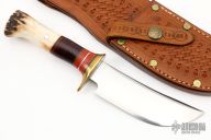 This Scagel Hunter by James Behring features a satin finished convex ground blade with false top edge, .154" blade stock and 1.266" blade depth, hidden tang construction. The handle has a brass guard, stag grip and red/black/aluminum/leather spacers. There is a compass inlaid into the pommel.  Comes with a brown leather sheath. Excellent Condition.