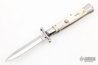 This Swing Guard Lockback Auto by AKC Italy has a polished stainless steel spear point blade with false top edge. Handle has white horn scales with stainless steel bolsters, brass liners, and stainless steel back spacer and lock. Has safety. Has a few light scratches, otherwise excellent condition.
