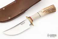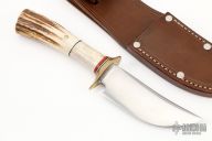 This Fighter by James Behring features a satin finished convex ground blade with a false top edge, .238" blade stock and 1.384" blade depth, hidden tang construction. The handle has a brass guard, sambar stag and elk horn grip with brass pins and black/red spacers.  There is a compass inlaid into the pommel. Comes with a brown leather sheath.  Excellent Condition.