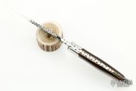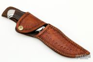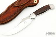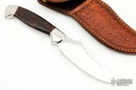 This skinner by Jay Fisher features a mirror polished blade with fileworked spine and tang, .195" blade stock and 1.383" blade depth, full tapered tang construction. The handle has stainless steel dovetailed bolsters, front and rear, Honduran Rosewood burl scales that have been triple vacuum impregnation with a mixture of tug oil and mineral solvents. Comes with hand tooled brown leather sheath. Has a few light scratches, otherwise excellent condition.