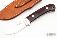 This Skinner by Steve Johnson features a mirror polished blade with notched thumbrest, .175" blade thickness and 1.006" blade depth, full tapered tang construction. The Bird's Head style handle has a nickel silver guard and maroon linen micarta scales. Comes with a brown leather sheath. Excellent condition.