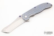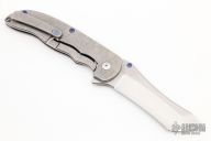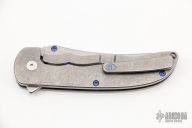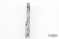 This Norseman (#2082) by John Grimsmo features a tumbled blade with a single anodized titanium thumb stud, notched thumb ramp and flipper. Stonewashed and anodized titanium frame with a honeycomb pattern front scale and titanium screws. Matching tip up pocket clip.  Very smooth action that requires no wrist movement. Nice detent, lockup and blade seating. Rides on ceramic bearings. Comes with original box and COA, has a couple light scratches, otherwise excellent condition.