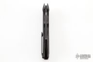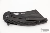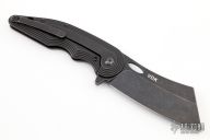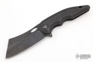 This War Admiral from VDK Knives features a blackwashed reverse tanto cleaver style blade with swedge, thumb hole and flipper. The handle is comprised of a blackwashed milled titanium frame over a titanium backspacer with matching tip up clip. Lanyard hole in pommel. Steel lockface insert on lock bar. Nice blade seating, detent and lock up. Excellent condition. Comes with a zippered case.