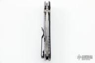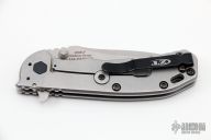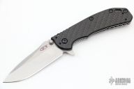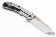 This 0566 Hinder Design Flipper by Zero Tolerance features a tumble finished drop point blade with swedge, dual thumb studs, notched thumb rest and flipper. The handle has a carbon fiber scale over a titanium liner and a tumbled titanium lockside over black barrel spacers. The black coated steel tip up clip is reversible for right or left hand carry. S/N 2085.  Excellent Condition.