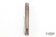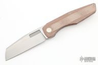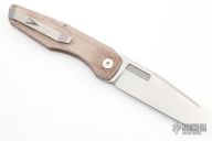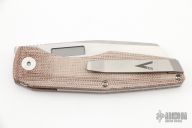 This Axon Third Run Folder by Vero Engineering features a hand rub satin finished blade with notched thumbrest and thumbhole. The handle has natural canvas micarta scales with inlaid liner, tip up titanium clip with hidden screws, titanium backspacer. Rides on bearings, nice detent, lockup and blade seating. Comes with zippered case and COA #1530. Excellent condition.