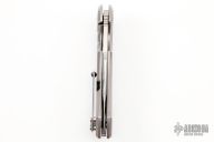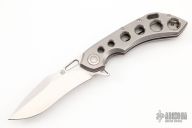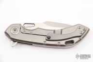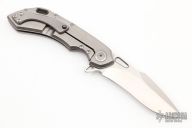 This Wayfarer 247 from Olamic Cutlery features a satin finished blade with swedge, thumbhole, notched thumb rest and flipper. The titanium handle scales are bead blast finished titanium with a matching pocket clip is positioned for tip up carry with a ceramic ball inlay, floating titanium backspacer. The Wayfarer 247 is very comfortable in the hand and flips well with no wrist action needed. Blade is centered when closed and locks up with no play. Comes with zippered case and maker's card with a serial number of T489H and dated 10-16-20. Excellent condition.