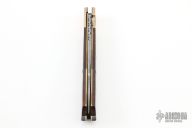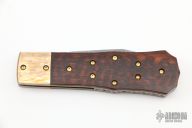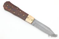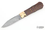This linerlock by Lonnie Williams features Damasteel blade with nail nick and fileworked. The handle has mokume bolsters, snakewood scales, gold plated screws, anodized titanium liners, fileworked Damasteel backspacer. Serial #226 on the inside of the backspacer. New from maker. Comes with COA.