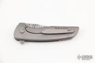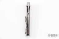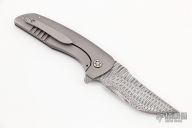This Hokkaido by John Barker features Fafnir Damasteel blade with notched thumbrest and flipper. The handle has a bead blast finished titanium frame and tip up clip and a floating Damasteel backspacer. Rides on bearings, nice detent, lockup and blade seating. Comes with cloth pouch. New from maker at the 2022 CCKS.
