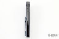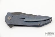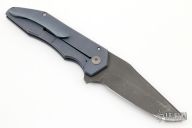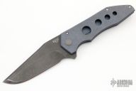 This Sabot by Koert Knives features a dark tumbled blade with swedge and flipper. The handle has a tumbled and anodized titanium frame with a matching backspacer and tip up clip with hidden screws. Rides on bearings, nice detent, lockup and blade seating. Comes with zippered case, COA and a copper Steel Flame molle clip and dogtag. Has some scratches, otherwise good condition.