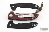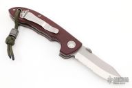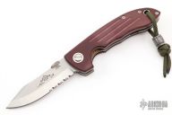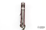 This XHD-Horseman-SF by Emerson Knives features a satin and stonewashed blade with custom thumbdisc and notched thumbrest. The handle has custom red canvas micarta scales with titanium pivot collars, tumbled titanium liners and notched backspacer, lanyard hole, tip up stainless steel clip, stainless steel lockface insert. Rides on bearings, nice detent, lockup and blade seating. Comes with original box, scales and papers. #0082 on blade. Excellent condition. Comes with a Damascus bead.