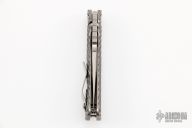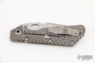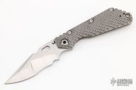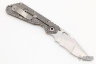 This Mick Strider custom SMF framelock folder has a Nightmare ground blade with notched thumbrest and thumbhole. The handle has a double gunner grip titanium frame with laser engraved titanium clip. Includes Hinderer "Lock Bar Stabilizer" for maximum reverse lock retention. Nice lockup, blade seating and detent. Comes with zippered case. New from maker at the 2022 CCKS.