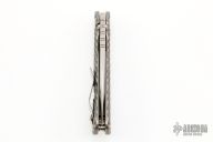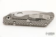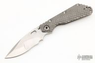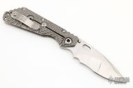 This Mick Strider custom SMF framelock folder has a Nightmare ground blade with notched thumbrest and thumbhole. The handle has a double gunner grip titanium frame with laser engraved titanium clip. Includes Hinderer "Lock Bar Stabilizer" for maximum reverse lock retention. Nice lockup, blade seating and detent. Comes with zippered case. New from maker at the 2022 CCKS.