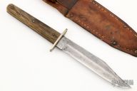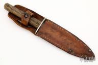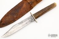 This anitque bowie by Wade & Butcher of Sheffield England features a clip point blade with false top edge, .110" blade stock and .894" blade depth, full tang construction. The handle has nickel silver guard, jigged bone scales. Comes with original brown leather sheath. Has scratches and patina, has been resharpened, otherwise good condition for a 100 year old knife.