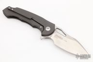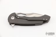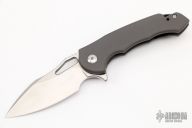This knife by Massdrop is a Ferrum Forge design, it features a satin finished blade with thumbhole, notched thumbrest and flipper. The handle has an bead blasted titanium frame, backspacer and reversible tip up clip, has a stainless lockface insert. Nice detent, lockup and blade seating. Excellent condition. Comes with a zippered case.