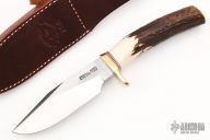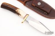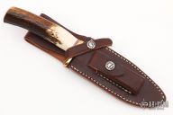 This Sergeant's Special by Randall Made Knife features a satin finished blade with sharpened top edge and a notched thumbrest, .215" blade stock and 1.350" blade depth, hidden tang construction. The handle has a brass guard and stag grip with red/white/blue spacers. Comes with a brown leather sheath. Excellent condition.