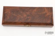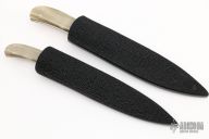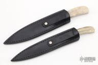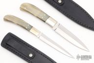 This Dagger Set by R. A. Frazier features a hand rub satin finished double edged blades, .172" blade stock and .964" blade depth on the larger one and .123" blade stock and .675" blade depth, full tapered tang construction. The handle has nickel silver bolsters and sheep horn scales with black liners and nickel silver pins. Includes a wooden presentation box, and black leather sheaths with stingray skin overlays. Excellent condition.