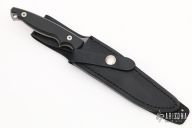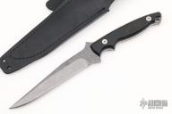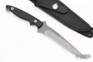 This Fighter by John Greco features a stonewashed blade with swedge, .203" blade stock and .982" blade depth, full tang construction. The handle is comprised of black scales over full tang construction with lanyard hole. Includes a black leather sheath. Excellent condition.