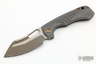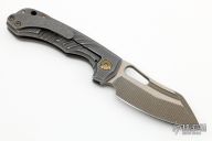 This Blood and Thunder V3 by Jason Stout features a bronzed blade with milled bevels, fullers and a thumbhole. The handle has a milled and tumbled titanium frame with a matching tip up pocket clip and a tumbled D2 backspacer. Nice detent, lockup and blade seating. Includes COA.  Excellent condition.