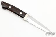 This Dagger by David Cosby features a mirror polished double edged blade with .171" blade stock and 1.013" blade depth, full tapered tang construction with wood scales and red liners. Comes with a zippered case. Has some light scratches, otherwise excellent condition.