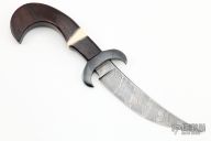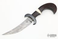 This Small Persian Fighter by Jot Singh features a Damascus blade with .142" blade stock and .866" blade depth, hidden tang construction. The handle has blued steel guard, black wood and mammoth ivory grip with silver spacers. Comes with a zippered case. Has a small scratch on the blade, otherwise excellent condition.