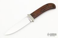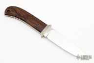 This custom hunter by William Welch features a mirror polished blade with .186" blade stock and .899" blade depth, full tapered tang construction. The handle has an engraved nickel silver single guard with wood scales, mosaic pins and black liners. Comes with a zippered case. "E28" on the blade. Excellent condition.