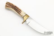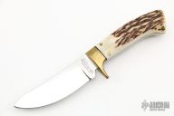This Skinner by Devon Butch Beaver features mirror polished blade with .130" blade stock and .814" blade depth, full tapered tang construction. The handle has brass guard, stag scales with brass pins. Comes with a zippered case. Has a few light scratches, otherwise excellent condition.