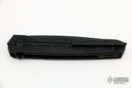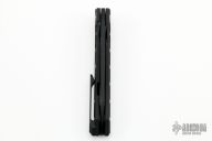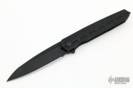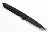 This Cypher Mini Dark by Deryk Munroe features a dark acid/tumble finished blade with fullers, a notched thumbrest and flipper. The handle has a dark acid/tumbled titanium frame, a matching titanium backspacer with lanyard hole, titanium tip up clip with hidden screws, and stainless steel lockface insert/internal over travel stop. Nice detent, lockup and blade seating. Rides on caged ceramic Si3N4 bearings. Comes with original box and papers. New condition.