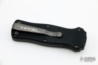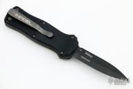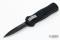 This 3350 Mini-Infidel by Benchmade features a black double edge dagger style D2 blade with fullers. The handle is comprised of a black anodized aluminum frame, ramped steel thumb slide and steel tip down clip. Excellent Condition.