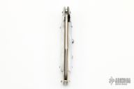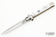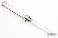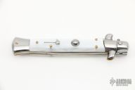 This swivel bolster auto features a mirror finished blade. The handle has stainless steel bolsters and butt, pearlex scales and brass liners. Strong opening. Has safety. Excellent condition.