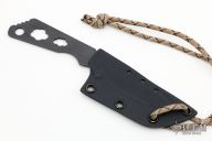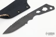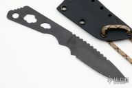 This ED by Strider Knives features a drop point blade with a notched thumbrest, .101" blade stock and 1.012" blade depth, integral skeletonized construction. The handle has a bullet shaped hole cut out to save weight. The knife has a rifle laser engraved into the handle. Comes with a kydex neck sheath. Excellent condition.