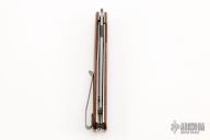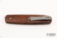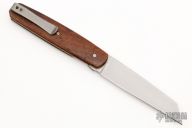 This MZ Wharncliffe front flipper by Brad Zinker features a stonewashed blade with a checkered thumbrest and front flipper. The handle has Jamaican Dogwood scales, satin titanium liners with laser engraved interiors, and a tumbled tip up titanium clip. Rides on bearings, nice detent, lockup and blade seating. Comes with a zippered case. New from maker at the 2022 NCKS. This is the very first of a new model!