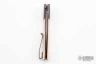 This Urban Trapper Flipper by Brad Zinker features a Nidhogg Damasteel blade with checkered thumbrest and flipper. The handle has dovetailed Zirconium bolsters, mammoth ivory scales, anodized titanium liners with laser engraved interiors and a tip up anodized titanium clip. Rides on bearings, nice detent, lockup and blade seating. Comes with a zippered case. New from maker at the 2022 NCKS.