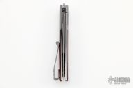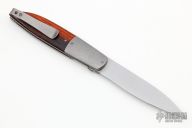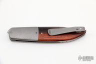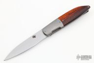 This Swayfront Flipper by Brad Zinker features a stonewashed blade with checkered thumbrest and front flipper. The handle has dovetailed and stonewashed titanium bolsters, cocobolo scales, satin titanium liners with laser engraved interiors and a tip up anodized titanium clip, fileworked titanium backspacer. Rides on bearings, nice detent, lockup and blade seating. Comes with zippered case. New condition.