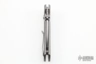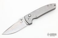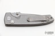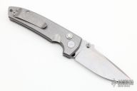 This midtech VECP buttonlock folder from Les George features a tumble finished, CNC flat ground blade and a stonewashed titanium frame with a matching clip that is positioned for tip up carry. Phosphorus bronze washers. Smooth action. Great blade seating and lockup. Comes in a padded/zippered case. New from maker at the 2022 NCKS.