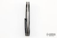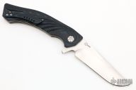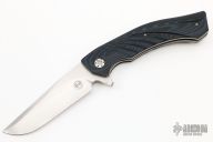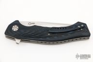 This Model 16 flipper by Andre Van Heerden features a hand rub satin finished blade with notched flipper. The handle has carved black/blue G-10 scales, bead blasted titanium liners, black G-10 backspacer and a black/blue tip up clip. Includes IKBS (Ikoma-Korth Bearing System) for fast and smooth flipper opening that requires no wrist action. Nice blade seating, detent, and lockup. Excellent work. Comes with zippered case. Excellent condition.