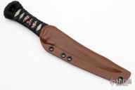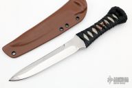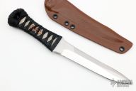 This Yari Tanto by Joe Watson features an upswept double edged blade with satin finished grinds, reinforced point taper, .169" blade stock and 1.043" blade depth, hidden tang construction. The handle has black cord wrap over white stingray skin with copper menuki. Bell pommel. Comes with a kydex sheath. Comes with COA, new from Maker.