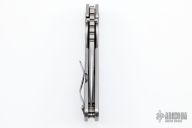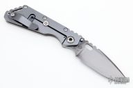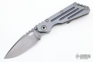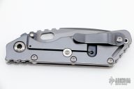This Mick Strider Performance Series SMF framelock folder features a black satin spear point blade with thumbhole and notched thumbrest. The handle has a black satin titanium frame with titanium clip, tip up carry. Jimping on blade spine. Includes Hinderer "Lock Bar Stabilizer" for maximum reverse lock retention. Nice detent, lockup and blade seating. New from maker at the 2022 CCKS.