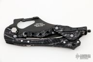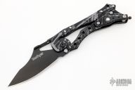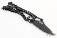This E.T. (External Toggle) folder by Kershaw is a Grant and Gavin Hawk design, it features a bead blasted blade, black aluminum frame, and the Hawks' external toggle locking mechanism. The knife is very easy to open and close, and simply gripping the handle will keep the blade locked in the open position. There is a knurled roller safety on the spine that can be engaged to prevent partial opening of the blade during carry. Excellent condition.