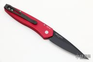 This Newport by ProTech Knives features a black spearpoint blade and red aluminum handle with tip up black stainless steel clip. Comes with original box and papers. #9 of 100. New from maker.