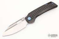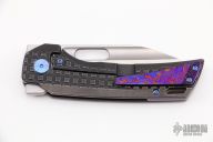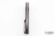 This Nymble Framelock Flipper by EMP EDC features a satin finished blade with notched thumbrest and flipper, and a thumbhole. The handle has a black tumbled and frag pattern milled frame, mokuti backspacer and tip up clip, comes with original anodized titanium backspacer and tip up clip. Comes with original box. Rides on bearings, nice detent, lockup and blade seating. Excellent condition.